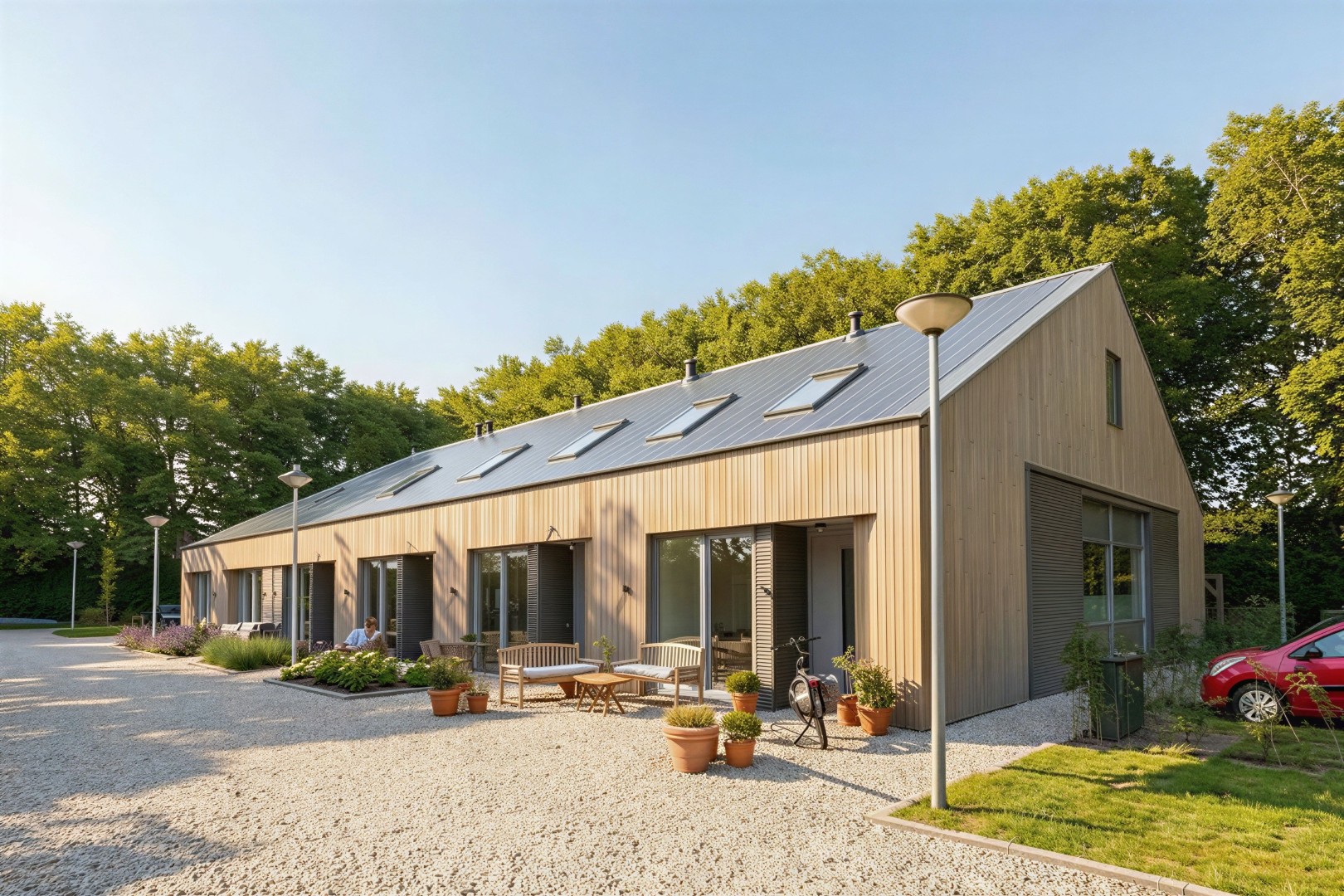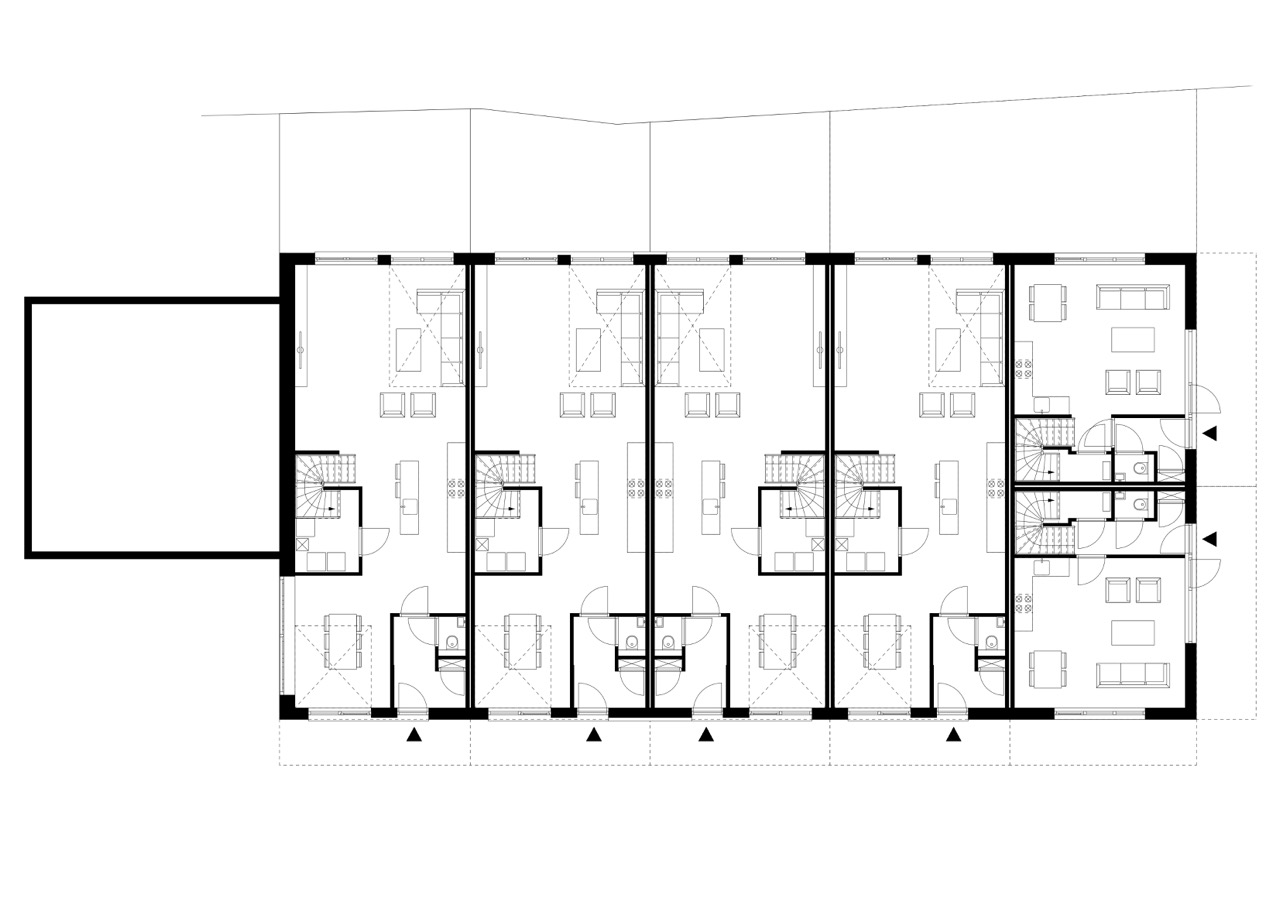 – zes woningen in een nieuwe schuur, op de plek en in de proporties van de gesloopte schuur, maar eigentijds vormgegeven met een warme houten lattenbekleding en zinken dak;