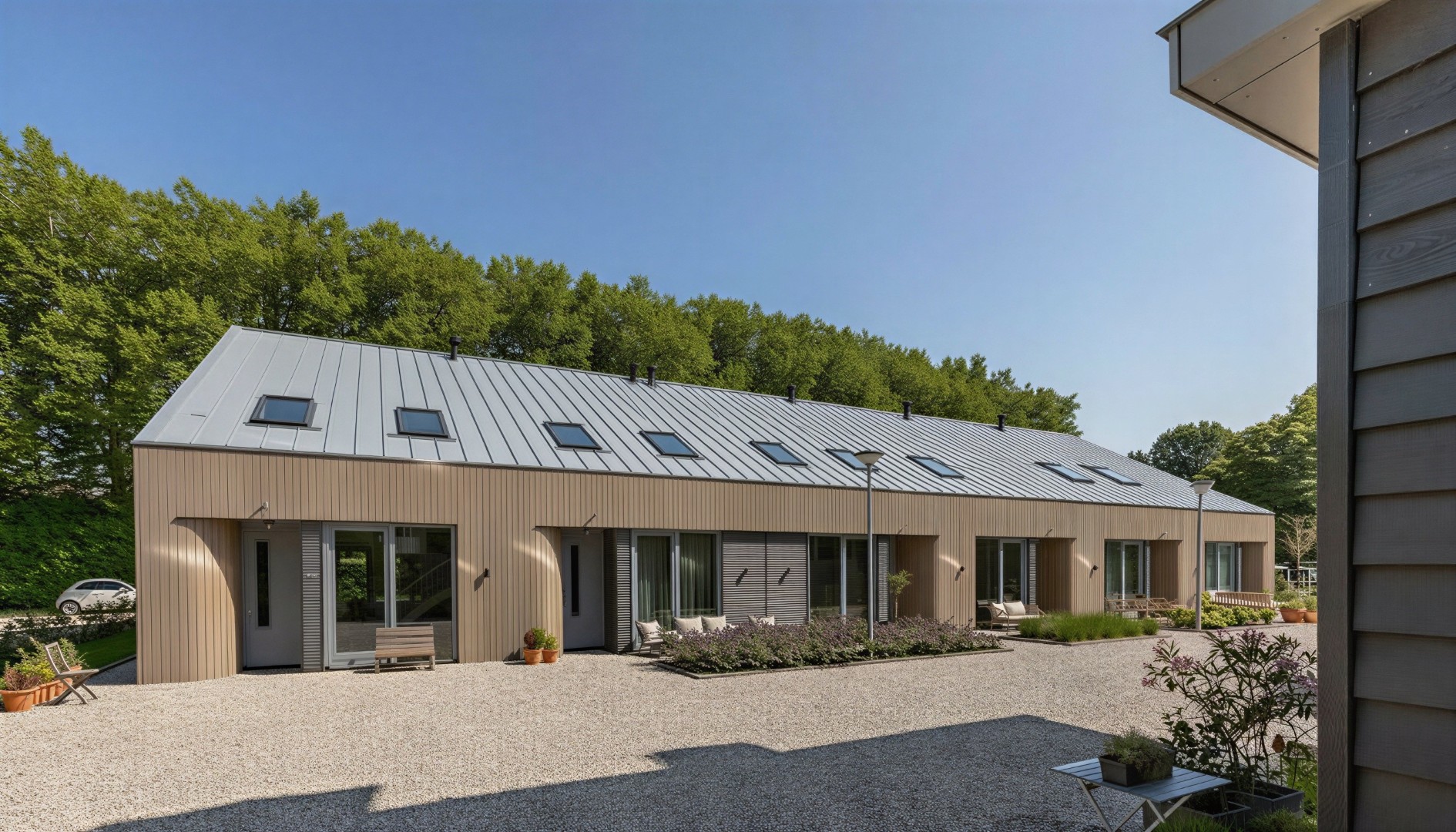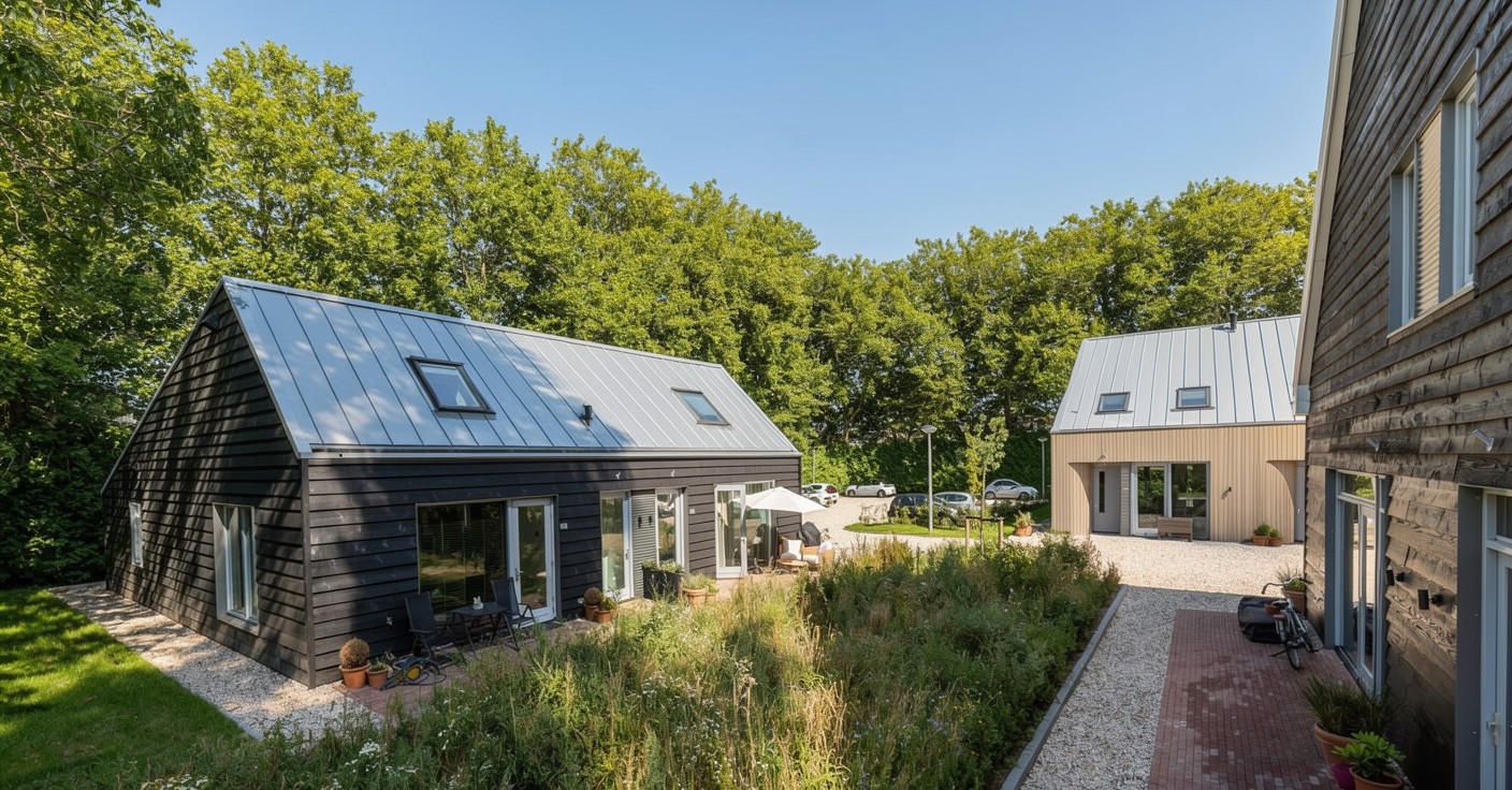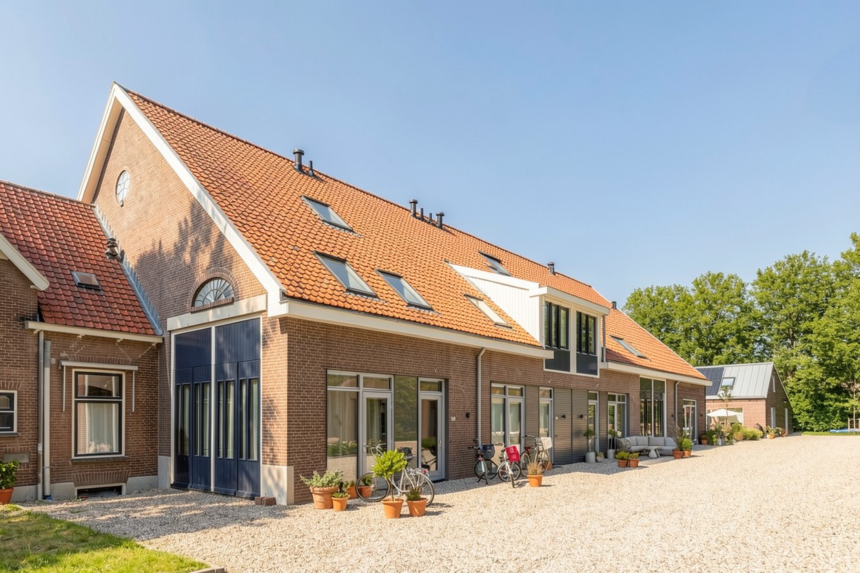 Het contrast tussen oud en nieuw vormt het hart van het ontwerp. Waar de herbouwde schuur zich voegt in de traditionele beeldtaal, zet de nieuwe schuur in op verfijnde eenvoud en een open, lichte uitstraling. De woningen zelf verrassen met royale hoogtes, vides en strategisch geplaatste dakramen, waardoor de diepe plattegronden ruimtelijk en helder aanvoelen. In de ‘bestaande schuur’ zijn de entrees vormgegeven door strakke stalen kaders dwars door de oude structuur heen. In de nieuwe schuur zijn de entrees uitnodigend en bijzonder vormgegeven: verdiept aangelegd en begeleid door zacht gebogen houten gevels.