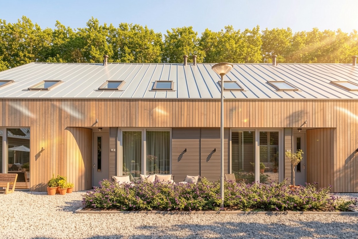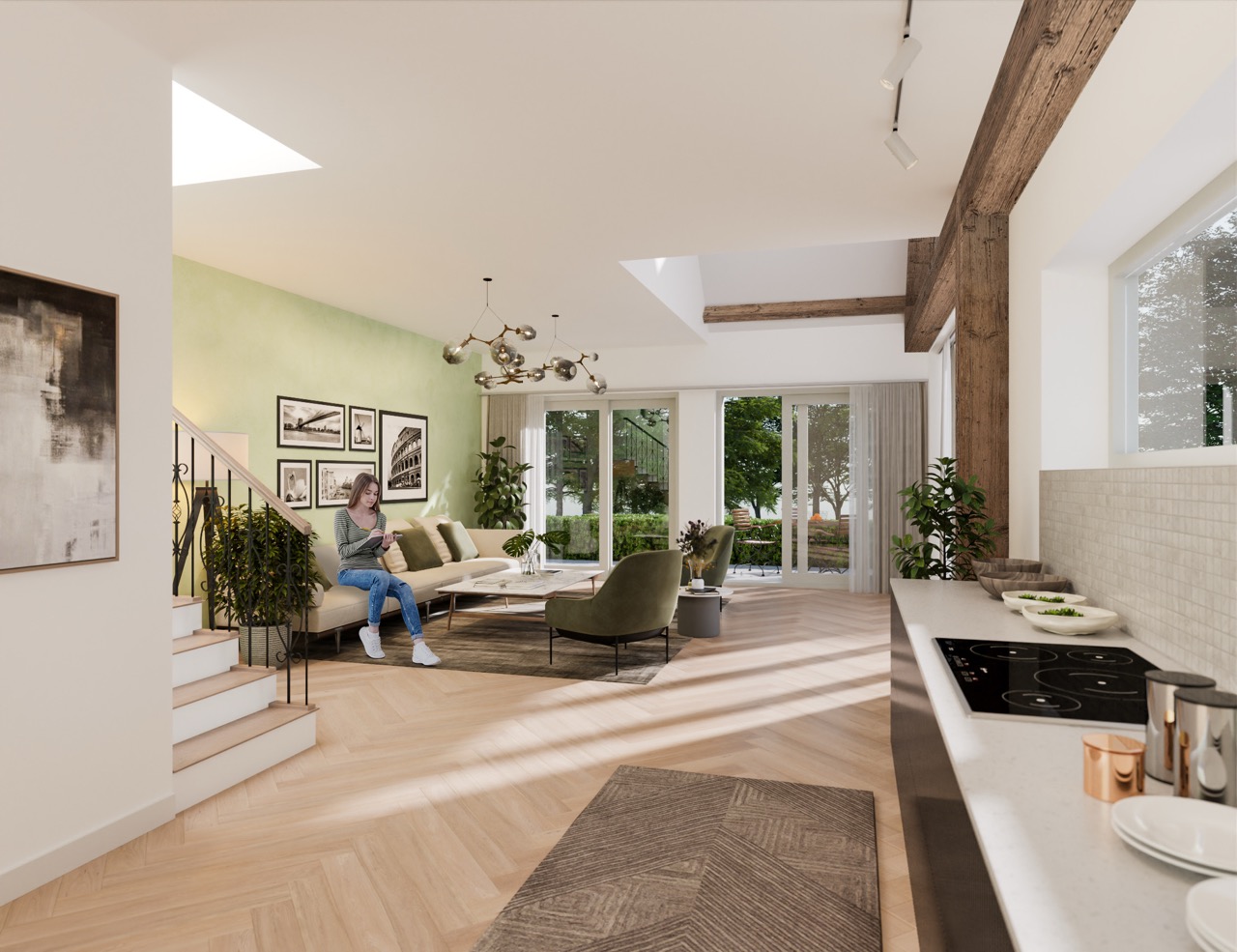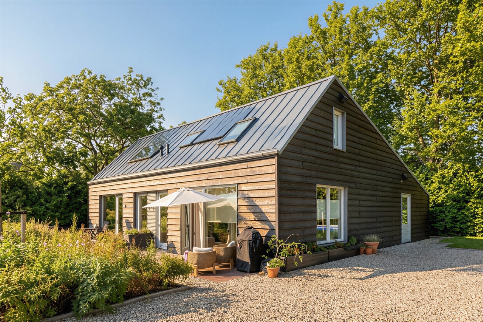 Het contrast tussen oud en nieuw vormt het hart van het ontwerp. Waar de herbouwde schuur zich voegt in de traditionele beeldtaal, zet de nieuwe schuur in op verfijnde eenvoud en een open, lichte uitstraling. De woningen zelf verrassen met royale hoogtes, vides en strategisch geplaatste dakramen, waardoor de diepe plattegronden ruimtelijk en helder aanvoelen. In de ‘bestaande schuur’ zijn de entrees vormgegeven door strakke stalen kaders dwars door de oude structuur heen. In de nieuwe schuur zijn de entrees uitnodigend en bijzonder vormgegeven: verdiept aangelegd en begeleid door zacht gebogen houten gevels.