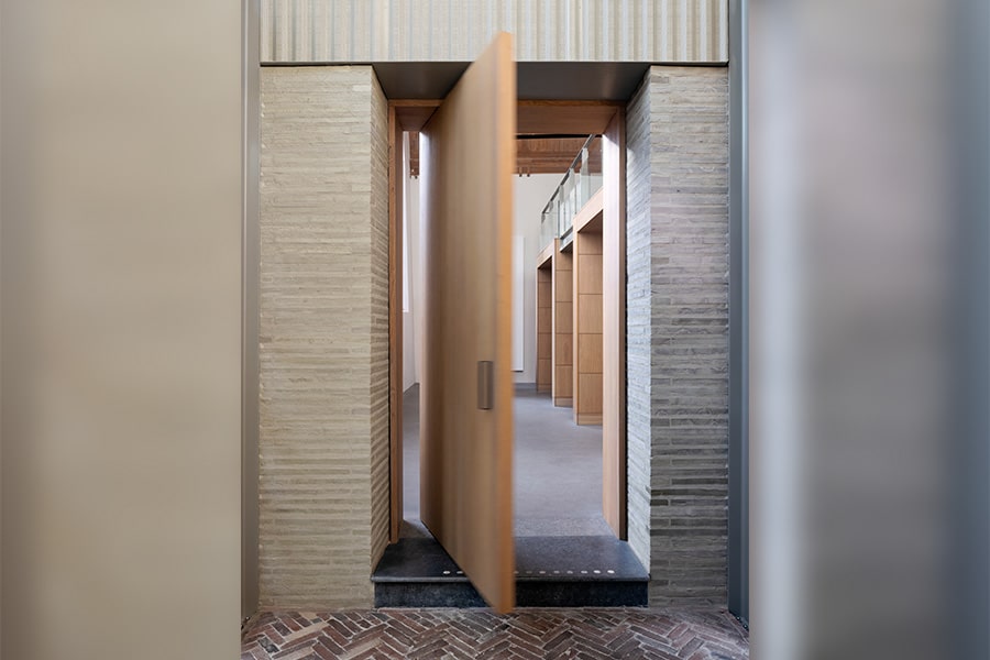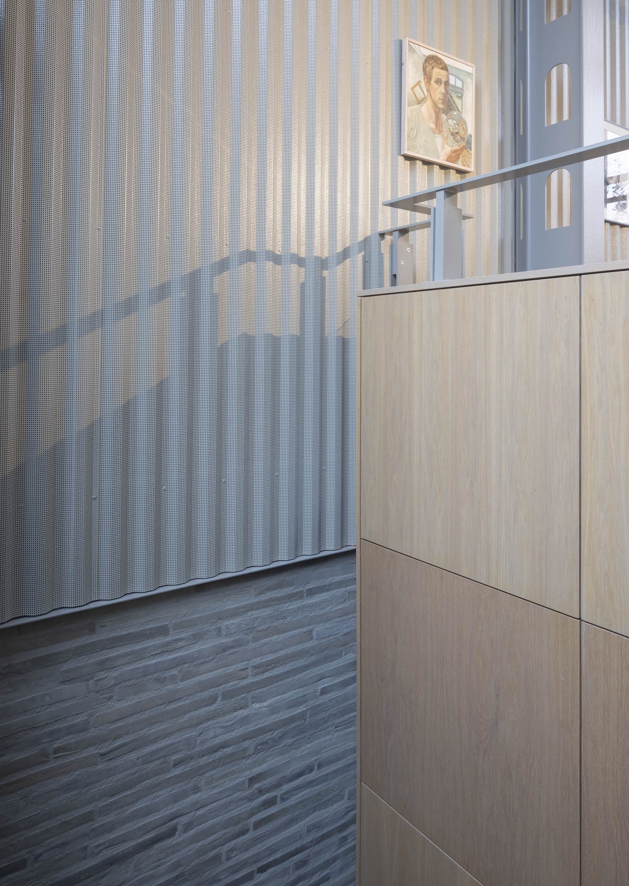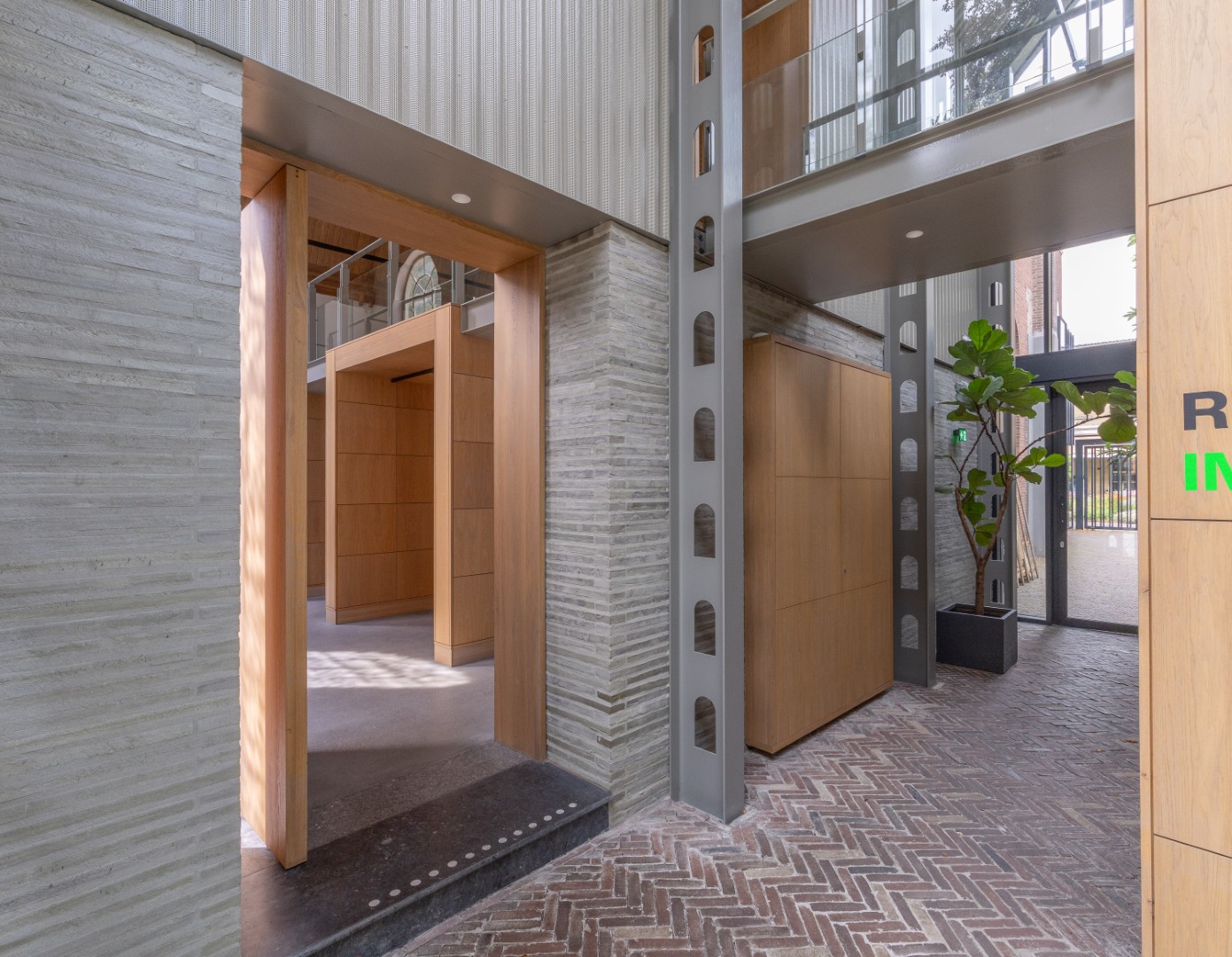 Materiaalgebruik speelt hierin een sleutelrol. Voor de nieuwe ingrepen kozen we onder meer voor de genuanceerde Petersen steen (Kolumba-formaat), waarvan de slanke proportie en subtiele kleurnuances aansluiten bij het historische metselwerk, maar zich in detaillering duidelijk als eigentijds manifesteren. In combinatie met glas en staal ontstaat een verfijnd spanningsveld tussen massa en transparantie. De nieuwe aanbouw en interieurinterventies zijn daarmee herkenbaar modern, maar vanzelfsprekend ingebed in het bestaande.