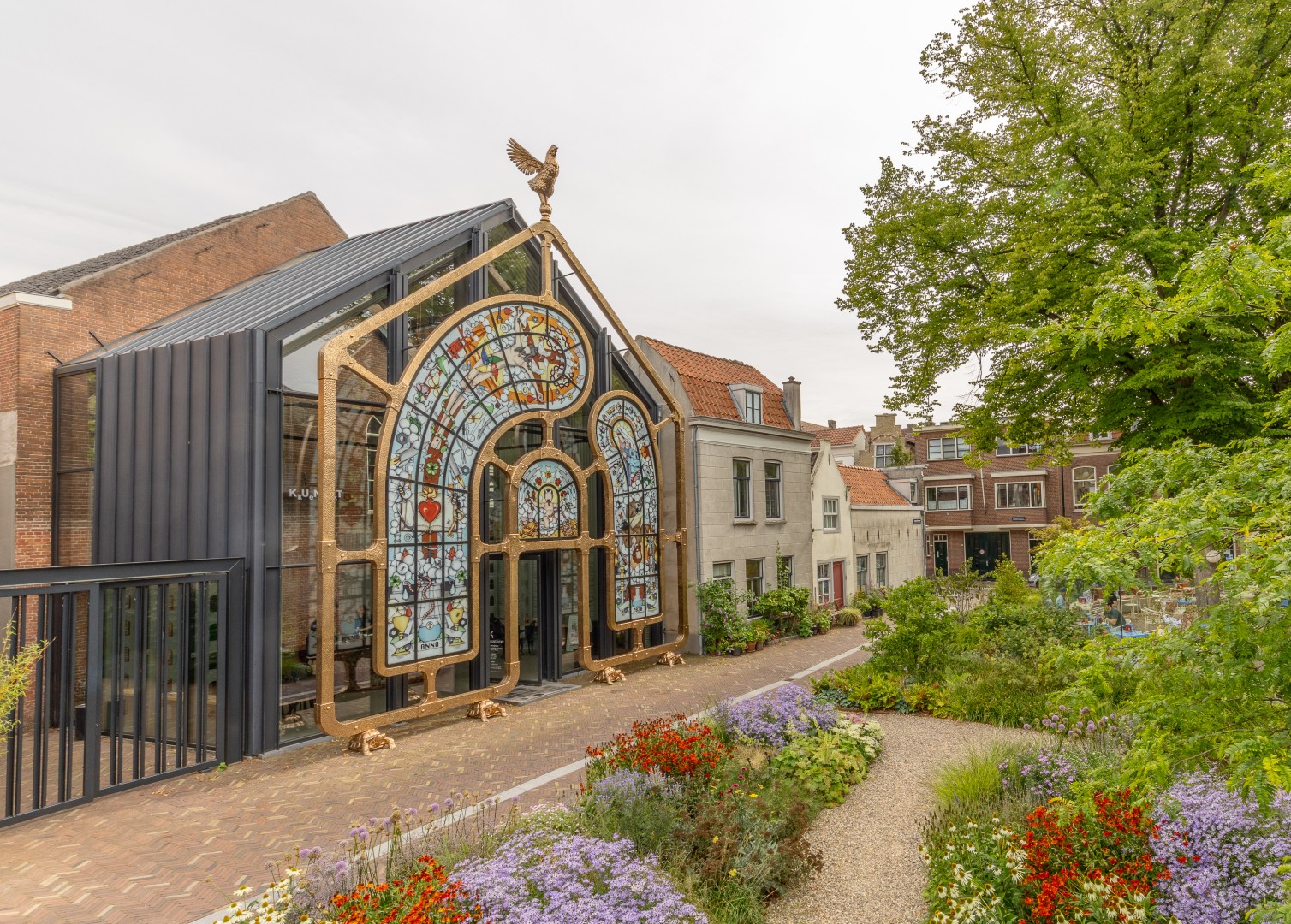 Een bijzondere toevoeging vormt de kunstgevel aan de Augustijnenkamp, ontworpen door Studio Job. Deze expressieve interventie geeft het gebouw een uitgesproken, hedendaagse identiteit richting de stad. Waar de oorspronkelijke kerk zich traditioneel en ingetogen toont, introduceert het kunstwerk een gelaagde, verhalende beeldtaal die de culturele functie van het gebouw expliciet maakt. Architectuur en autonome kunst versterken elkaar hier in één gevelbeeld: het monument wordt niet alleen gerestaureerd, maar ook opnieuw verteld.